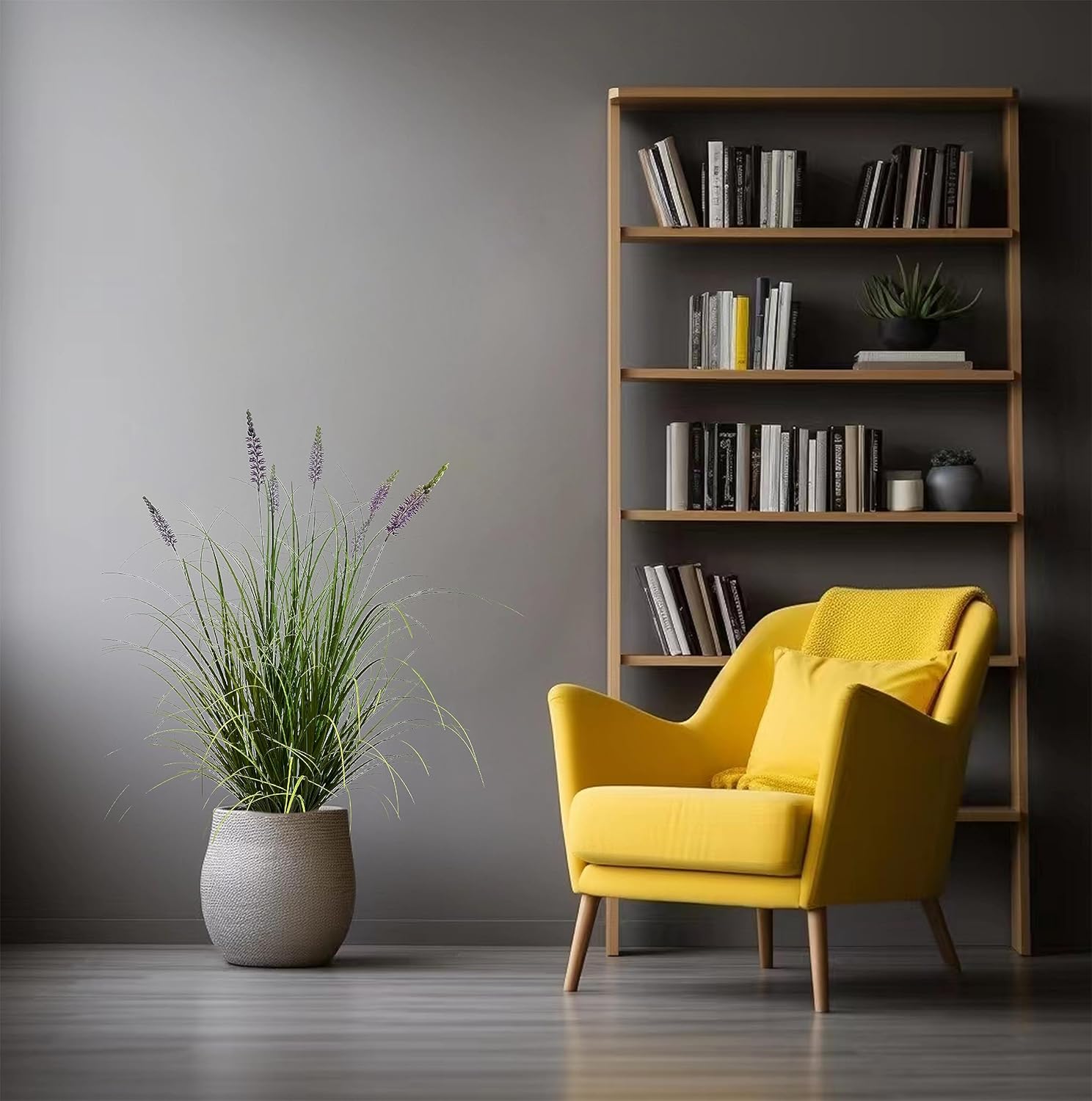 - 1.This faux plant features close to natural green grass with 5 lavender flowers, all inside a durable and solid flowerpot. Artificial lavender fake tall grass is 47 inches high.base with a black plastic pot in 5'' dia ,5.9''high.it’s easy to put it in a nice bigger planter as desired.