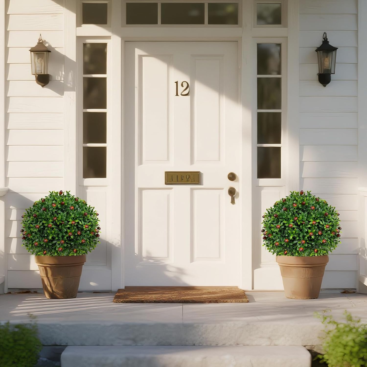 Artificial Olive Topiary Ball Trees with Ground Spike, Set of 2 UV Resistant Artificial Shrubs, Fake Evergreen Artificial Plant Bushes for Indoor Outdoor Front Porch Garden